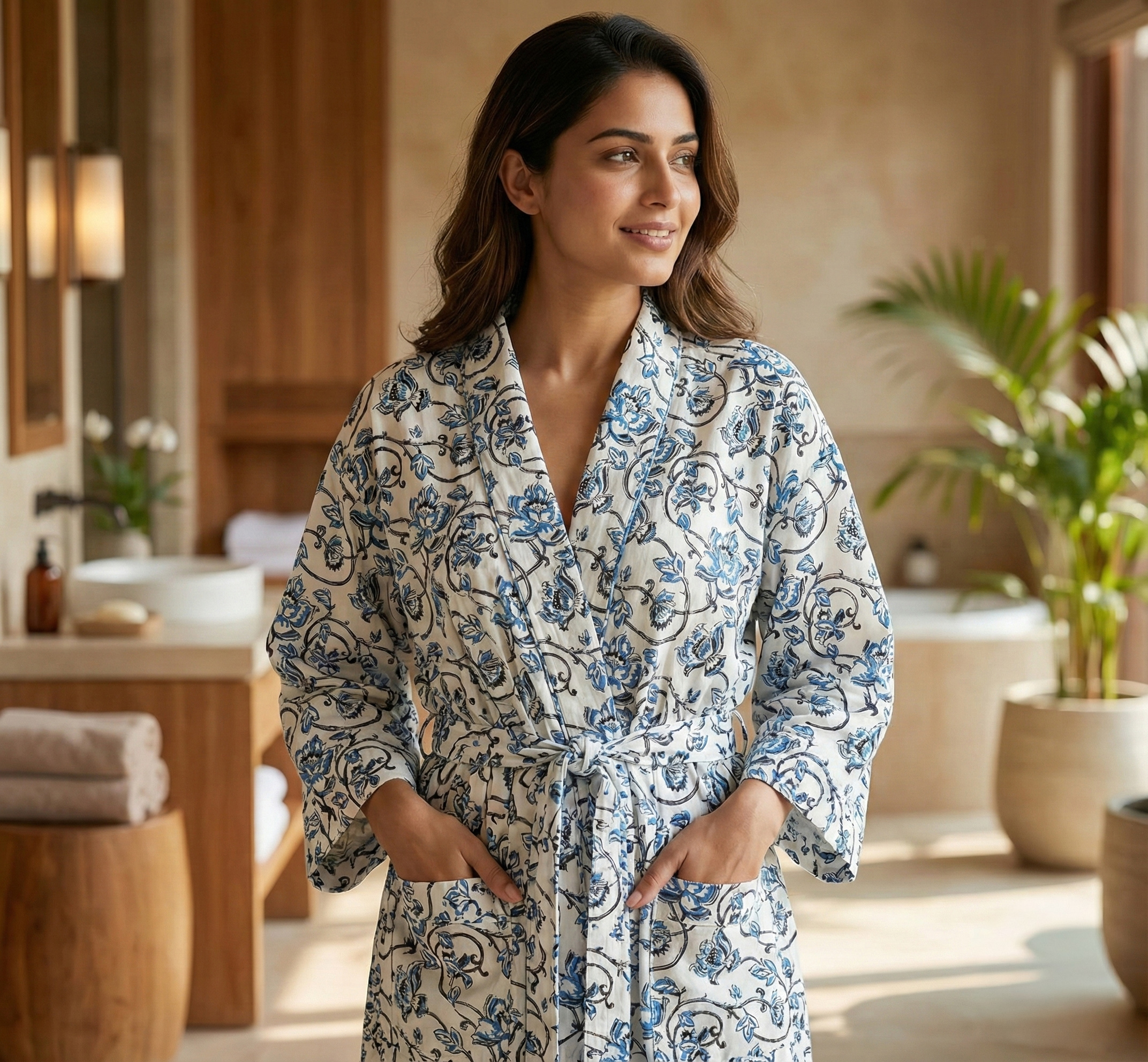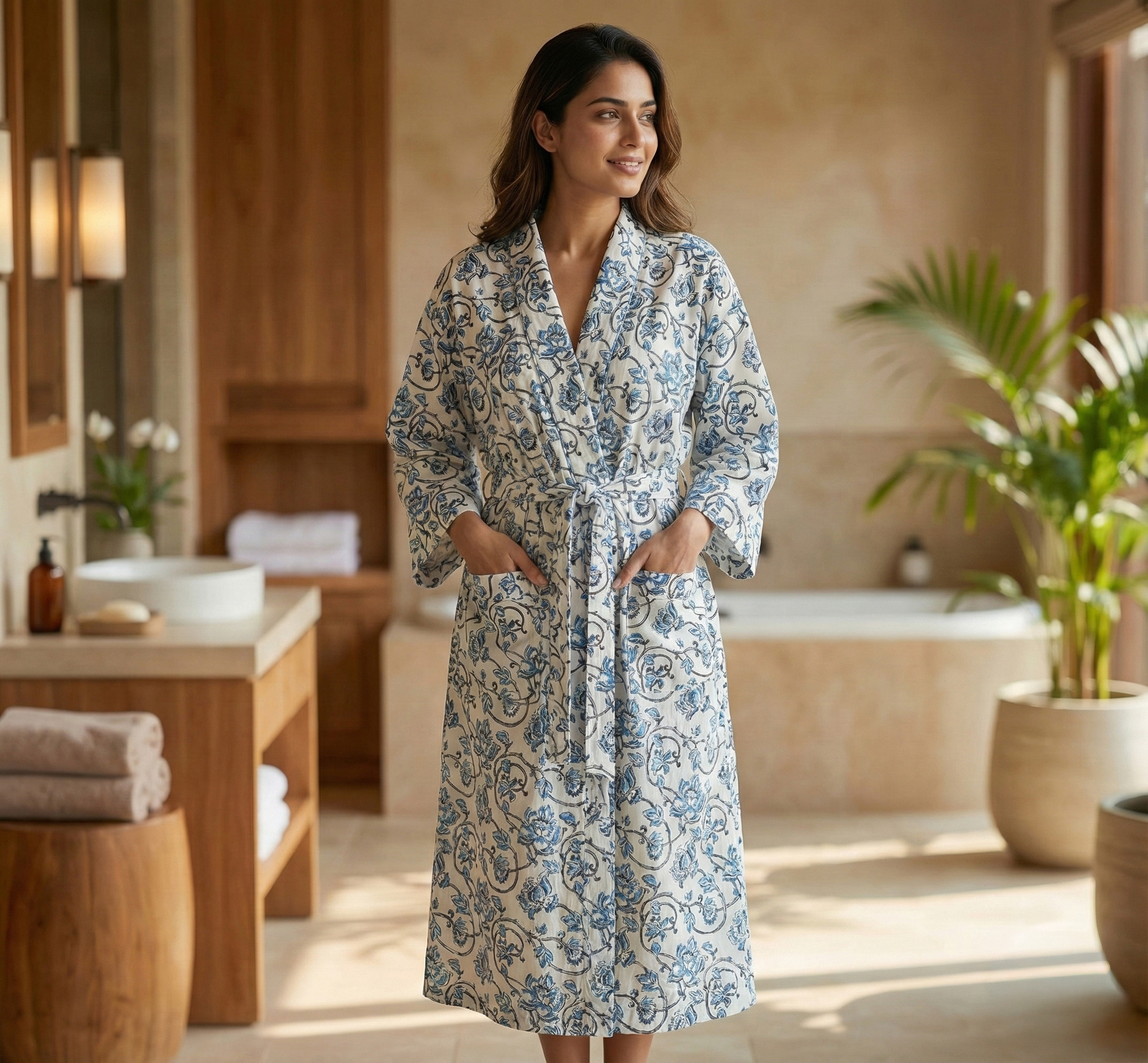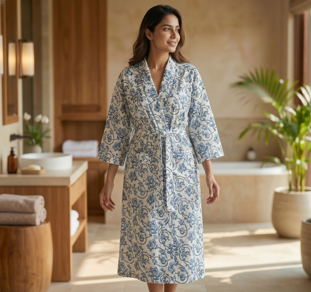 Blue Floral Block Print Robe, Soft Cotton Kimono Dressing Gown, Lightweight Summer Bathrobe With Pockets, Bridesmaid Gift, Boho Loungwear