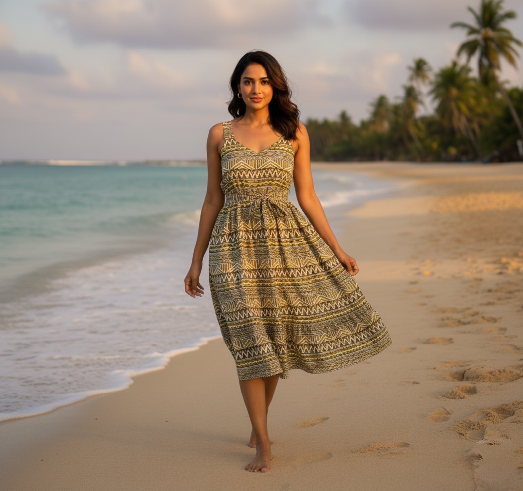 Crafted from a lightweight, breathable cotton or similar natural fabric, this dress features a striking geometric block-print or ethnic-inspired pattern in earthly tones of olive green, khaki, and cream.