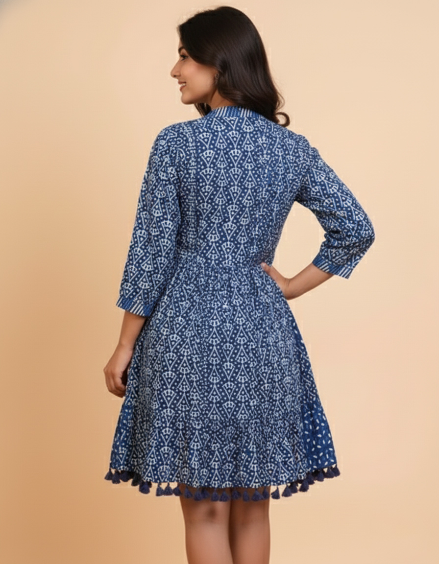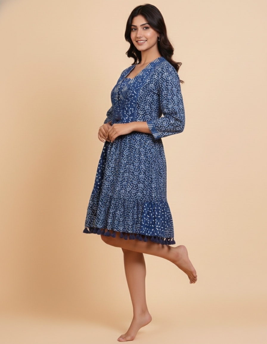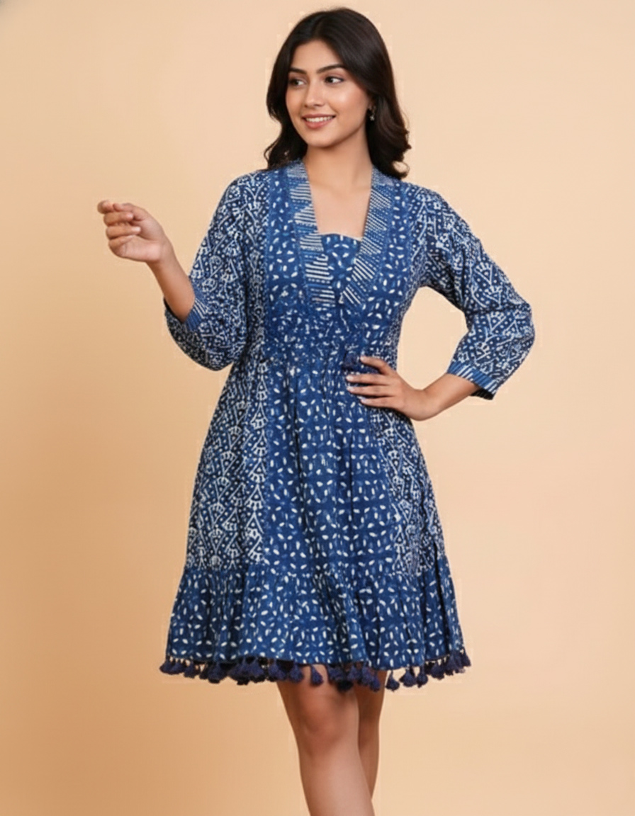 Step out in style with this charming Indigo Shibori and Block Print Cotton Mini Dress. Perfect for a breezy day out, a casual brunch, or your next vacation, this dress is a testament to traditional Indian textile artistry.