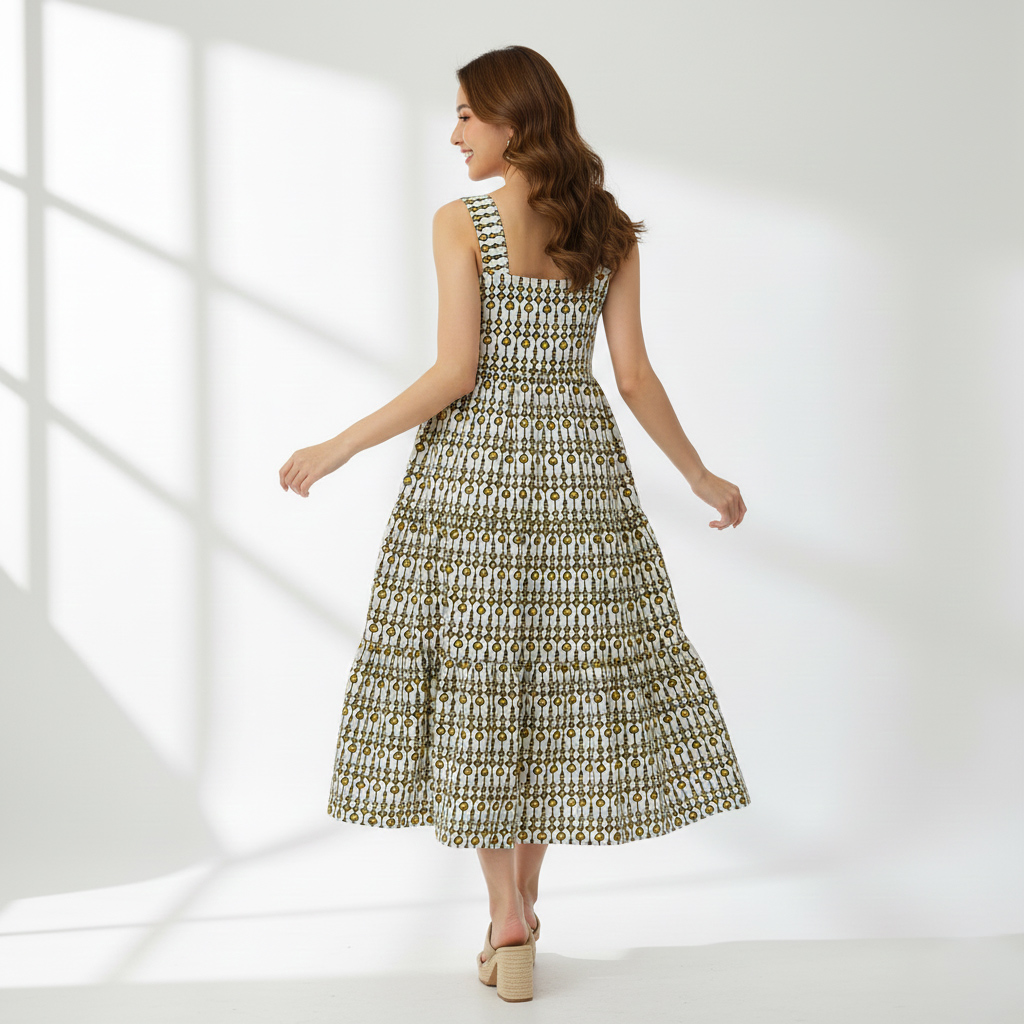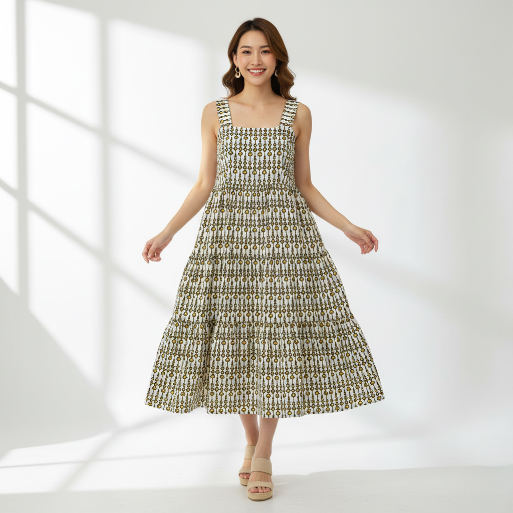 + Free ShippingStep out in effortless style with our beautiful Olive and lvory Geo-print Tiered Midi Dress.This piece perfectly balances vintage charm with modern , comfortable design.Crafted from a lightweight, breathable fabric.it features a captivating , repeating geometric pattern in shades of olive green and muted gold set against a crisp ivory background.