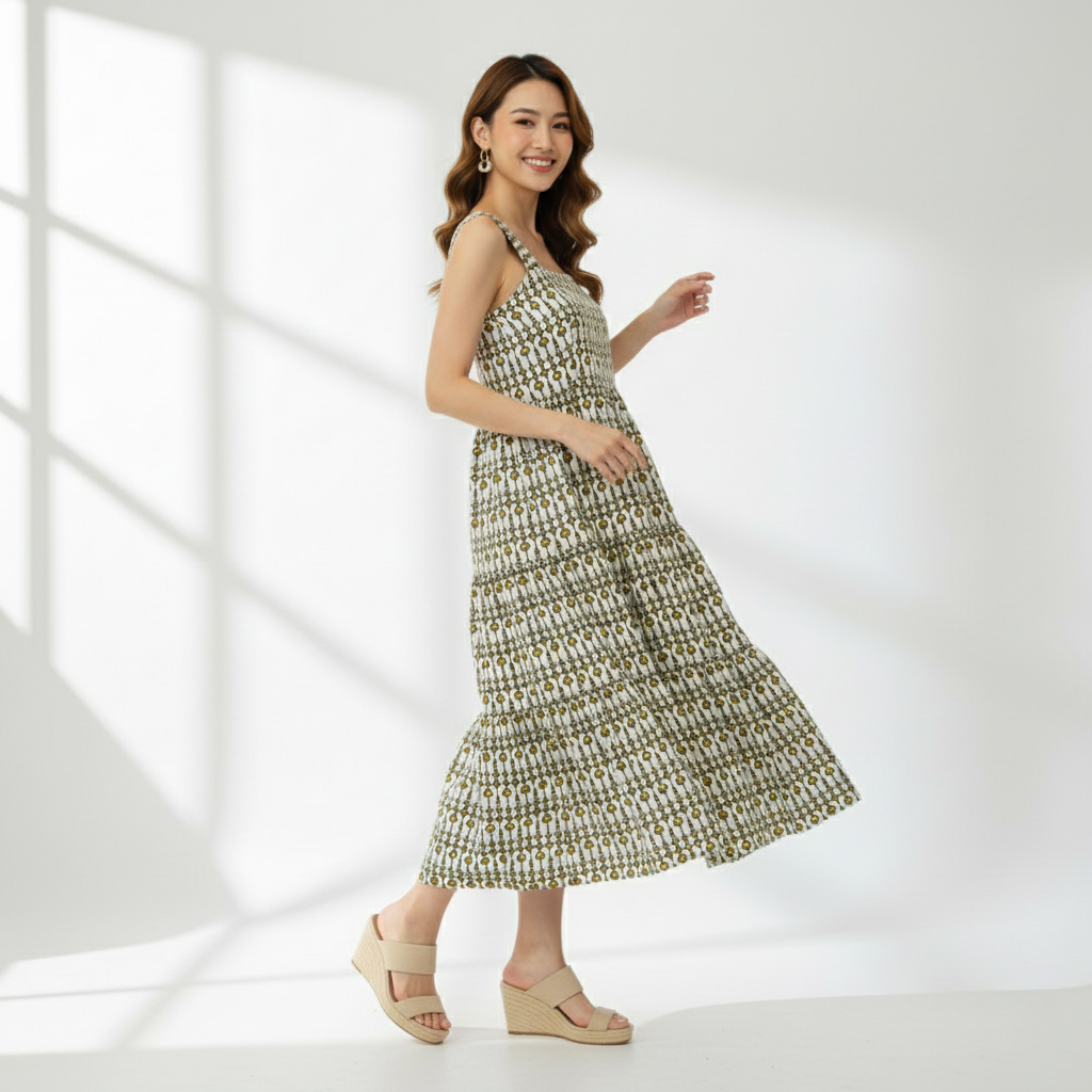 Olive Green & White Print Square Neck Midi Dress ,Smocked Back Sleeveless Tiered Sundress
